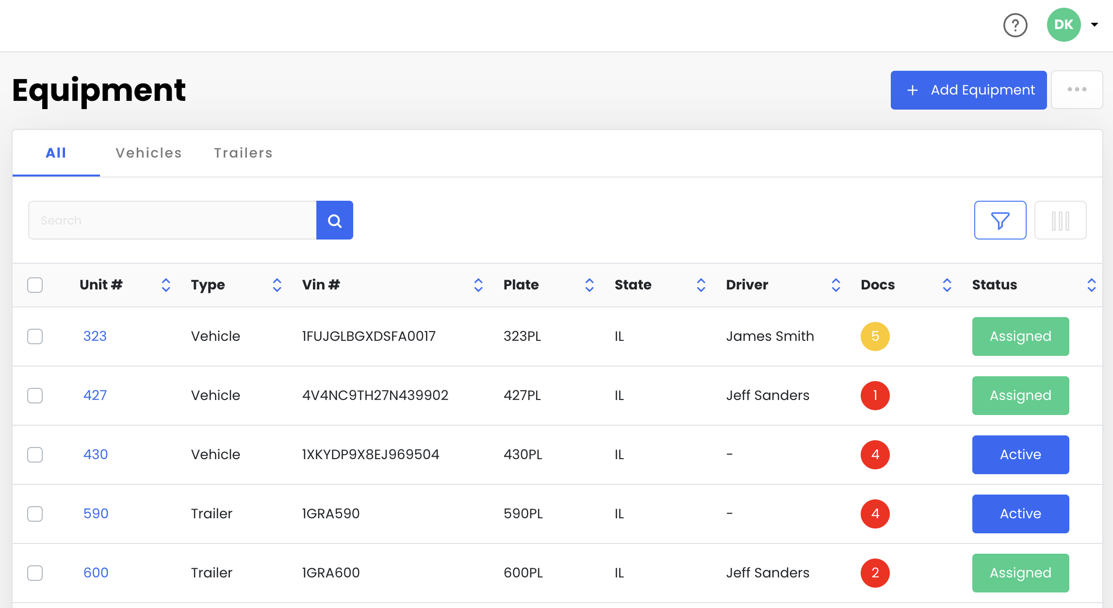 Click + Add Equipment. (vehicle or trailer)