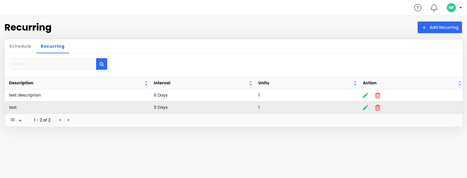 View all recurring schedules in a table showing Description, Interval, and Units.