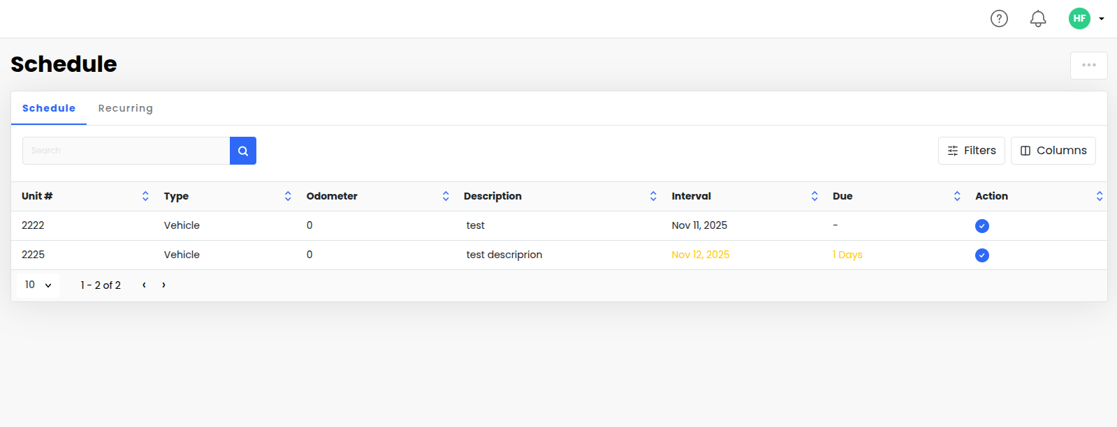 Once recurring schedules are added, they will automatically appear in the Schedule tab as scheduled maintenance tasks.