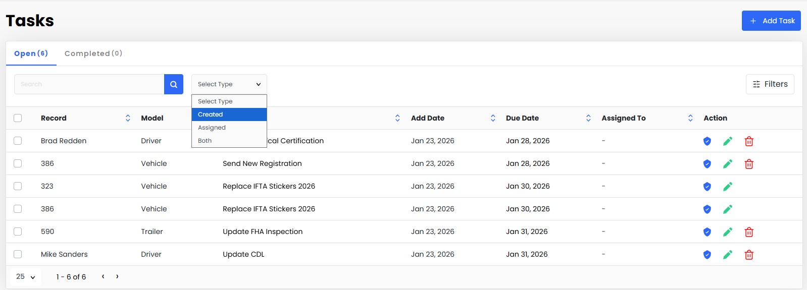 On the left side there are Complete (Blue Shield), Edit (Green Pencil) and Delete (Red Bin) options to manage your Tasks
